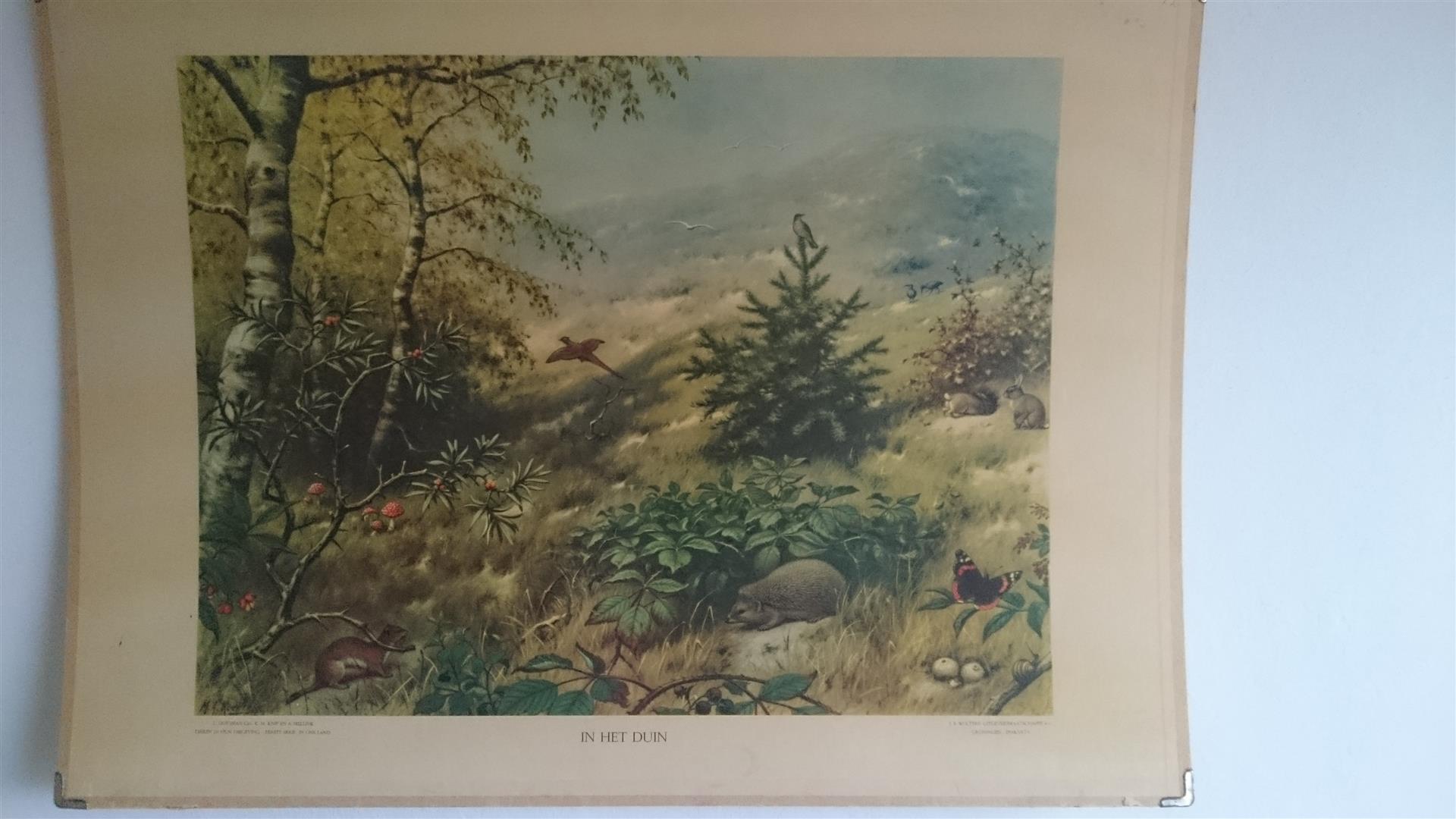 Fraaie antieke schoolplaat getiteld “In het duin”, uit 1950. Met bijplaat.